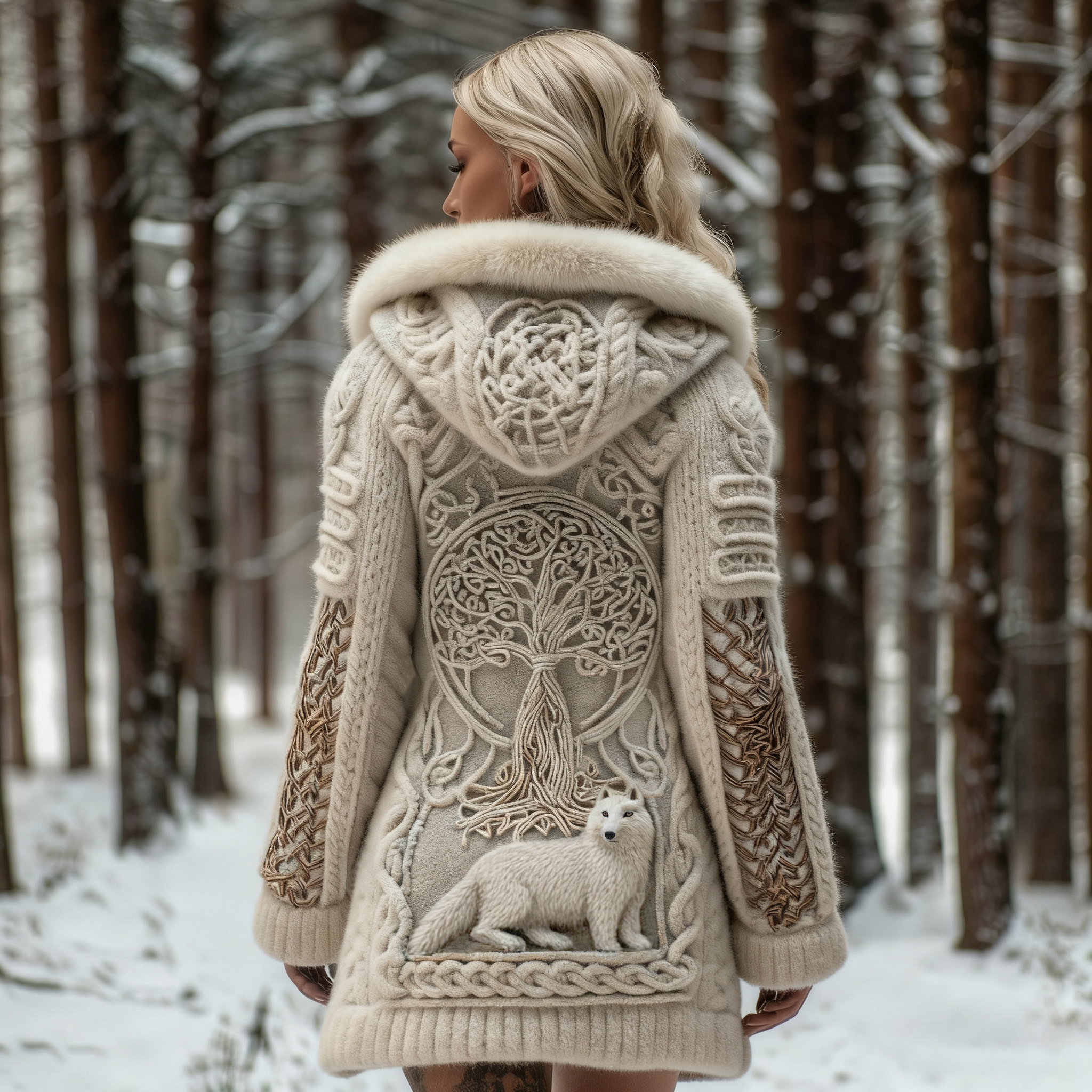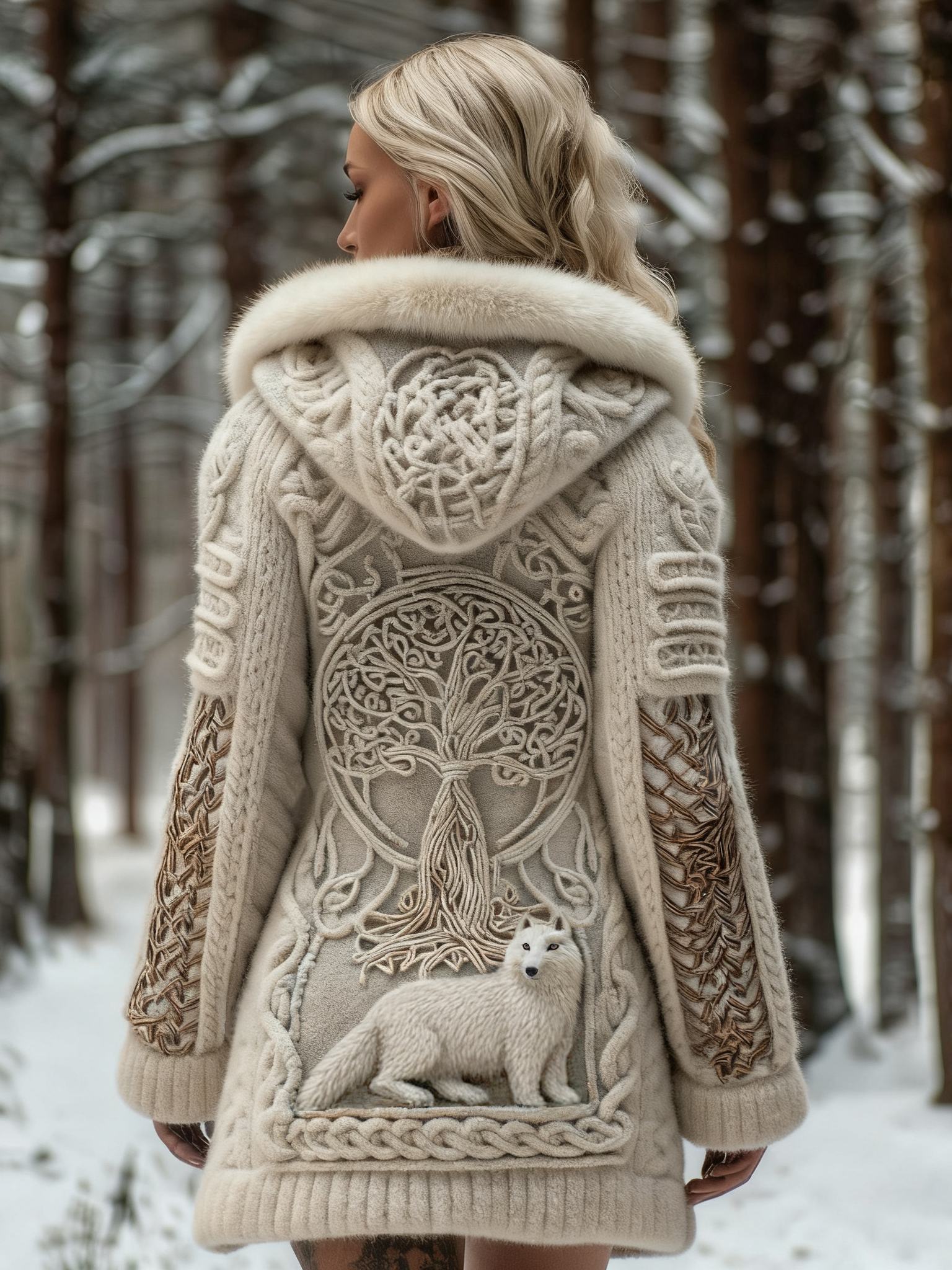 Women's White Fox And Tree Of Life Celtic Jacquard Cozy Fur Collar Knit Hooded Cardigan